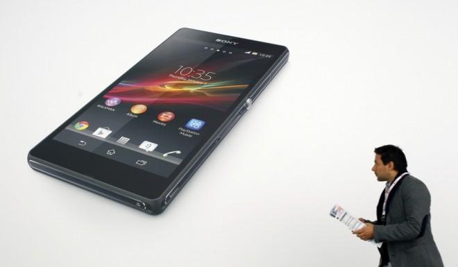 man checks a map as he walks past an advertising of the new Sony Xperia